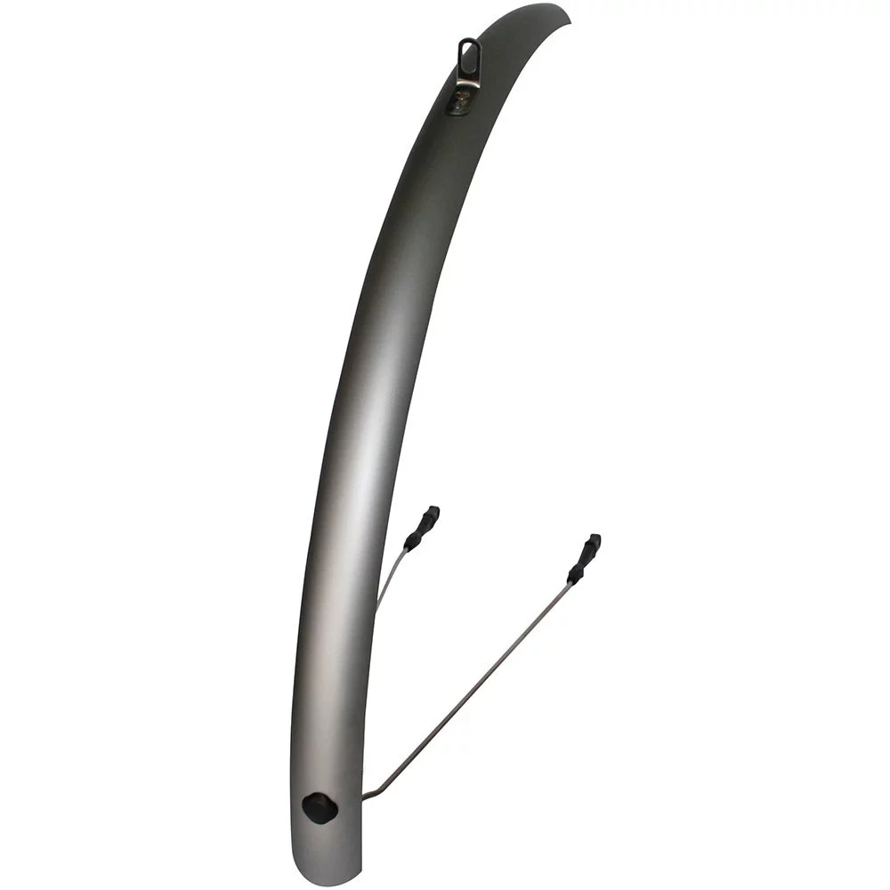 The matte black or silver-colored ´´Splash Protect DLX´´ mudguards from CONTEC are sturdily made of aluminum. They hold securely on the wheel over the 4 mm thick, black satin steel struts. The struts for the front mudguard are equipped with a Mini Clip XL safety system should about a branch get into the spokes, the struts are released from the stable connection.